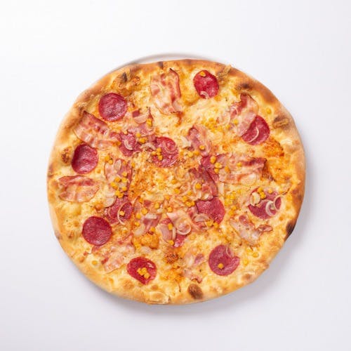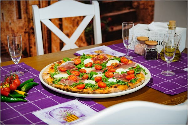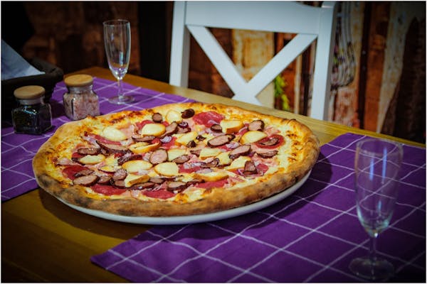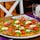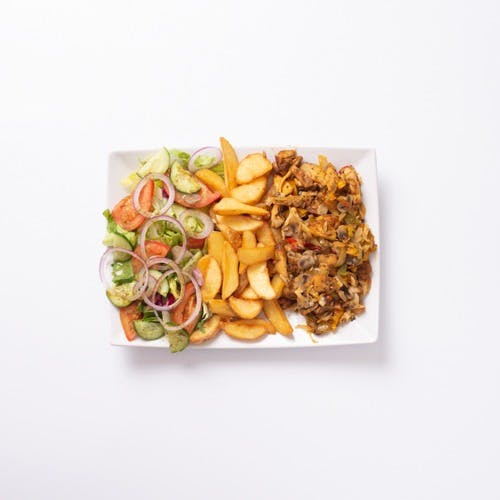 mix sałat, kurczak, pomidory, ogórek, czerwona fasola i cebula prażona, podawane z pieczywem czosnkowym